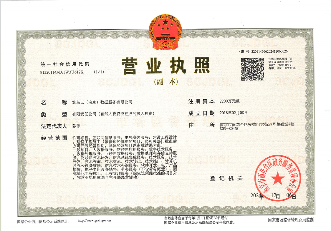 新立訊科技集團(tuán)全資子公司 “南京新立訊物聯(lián)網(wǎng)技術(shù)服務(wù)有限公司”經(jīng)國(guó)家市場(chǎng)監(jiān)督管理總局核準(zhǔn),南京市市場(chǎng)監(jiān)督管局登記備案,正式更名為“算鳥(niǎo)云(南京)數(shù)據(jù)服務(wù)有限公司”。