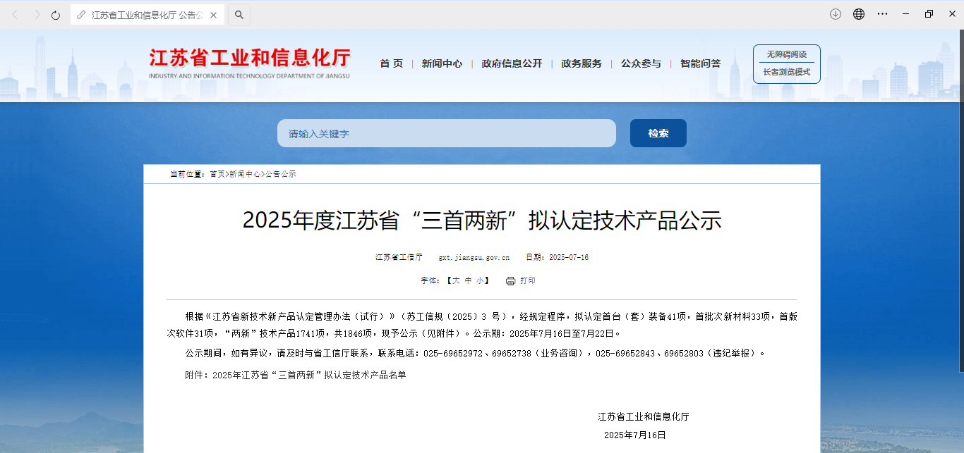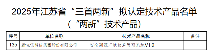 近日,江蘇省工信廳《2025年度江蘇省“三首兩新”擬認定技術產品名單》公布,新立訊科技集團《安全溯源產地信息管理系統V1.0》位列“兩新技術產品”名單中。
