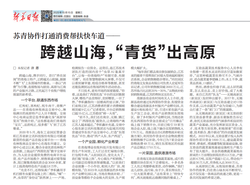 “前不久,我們還在南京、無錫、鎮(zhèn)江設(shè)立了‘西部優(yōu)選’提貨點,讓青海特產(chǎn)離江蘇人越來越近?!崩罘e鑫補充道,交易中心股東新立訊科技集團還與鹽城共同投資建成華東農(nóng)產(chǎn)品交易中心,打造“東部優(yōu)品”平臺,推動“西產(chǎn)入東、東產(chǎn)西送”。