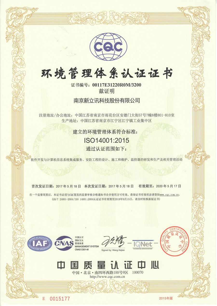 2017年5月,新立訊經中國權威認證機構CQC(中國質量認證中心)全面、嚴格的評定與審核,正式通過ISO9001國際質量管理體系認證、ISO14001國際環境管理體系認證、OHSAS18001職業健康安全管理體系認證三大國際管理體系認證,并獲得相關證書。證書涵蓋范圍包括軟件開發與計算機信息系統集成服務,安防工程的設計、施工和維護,溫控器的研發和生產及相關管理活動。這意味著新立訊成為CNAS(中國合格評定國家認可委員會)、IQNet(國際認證聯盟)和IAF(國際認可論壇)三方共同認可的綜合數據應用服務商,更標志著新立訊的質量管理、環境管理、健康安全管理等已達到國際先進水平。同時此三項證書的取得是對新立訊企業管理理念和質量管理水平的充分肯定,也為企業向社會提供優質的產品和服務提供了強有力的保障。