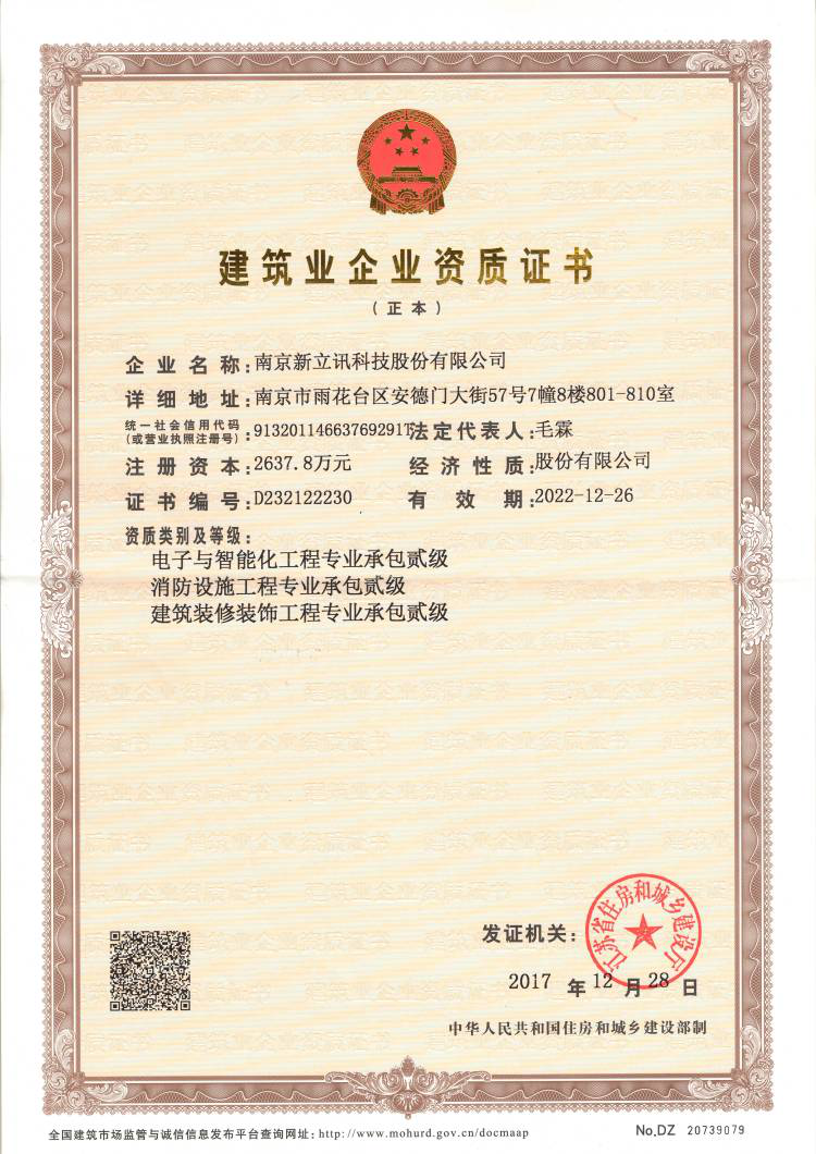2017年12月,南京新立訊科技股份有限公司獲由江蘇省住房和城鄉(xiāng)建設(shè)廳頒發(fā)的《建筑業(yè)企業(yè)資質(zhì)證書》,包含“電子與智能化工程專業(yè)承包”、“消防設(shè)施工程專業(yè)承包”及“建筑裝修裝飾工程專業(yè)承包”三項資質(zhì),證書編號:D232122230,證書有效期:2022年12月26日。