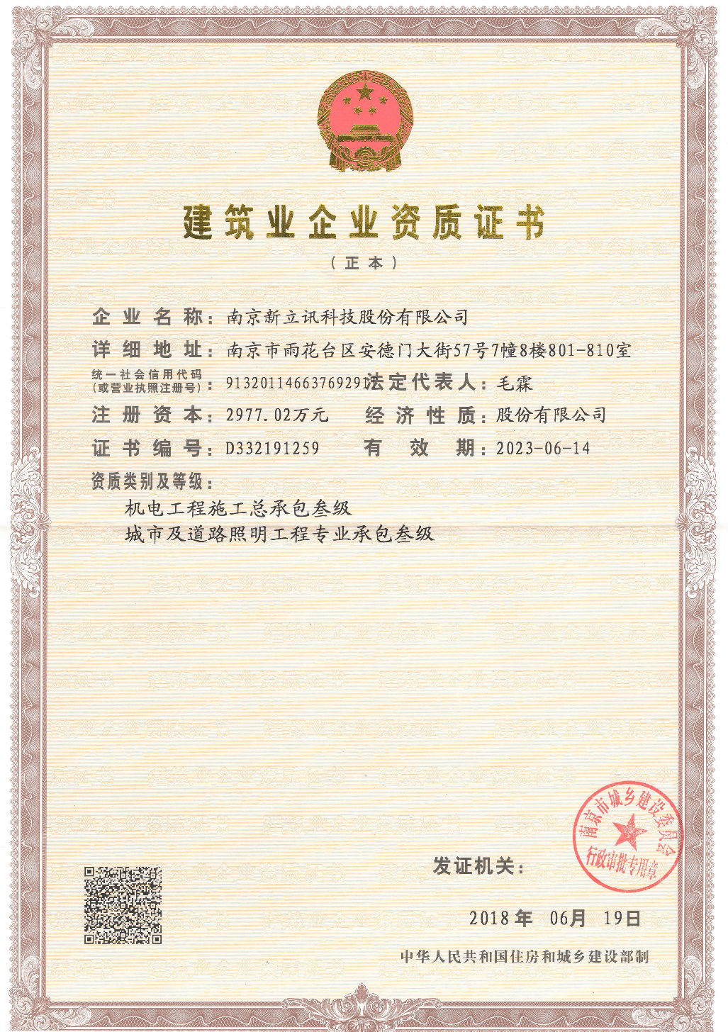 2018年6月19日,新立訊再獲南京市城鄉(xiāng)建設(shè)委員會頒發(fā)的機電工程施工總承包、城市及道路照明工程專業(yè)承包資質(zhì)證書。