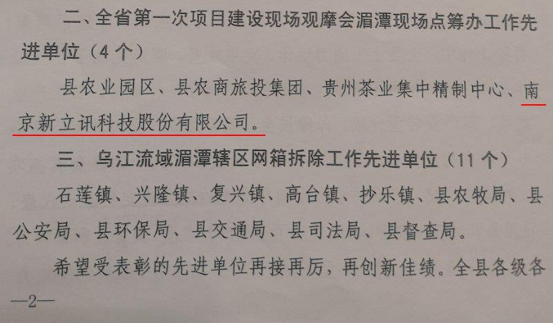 2018年5月16日,貴州省湄潭縣委、縣人民政府對南京新立訊科技股份有限公司在2018貴州茶“一節一會”籌備、貴州省全省第一次扶貧項目建設現場觀摩會湄潭現場點籌辦等工作中的優秀表現及突出貢獻進行通報表揚。