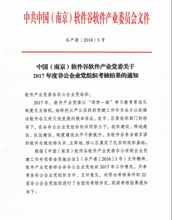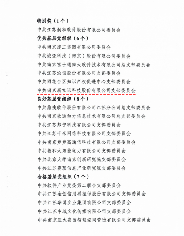 2018年5月8日,根據《中國(南京)軟件谷軟件產業黨委關于2017年度非公企業黨組織考核結果的通知》,中共南京新立訊科技股份有限公司支部委員會榮獲“優秀基層黨組織”榮譽稱號。