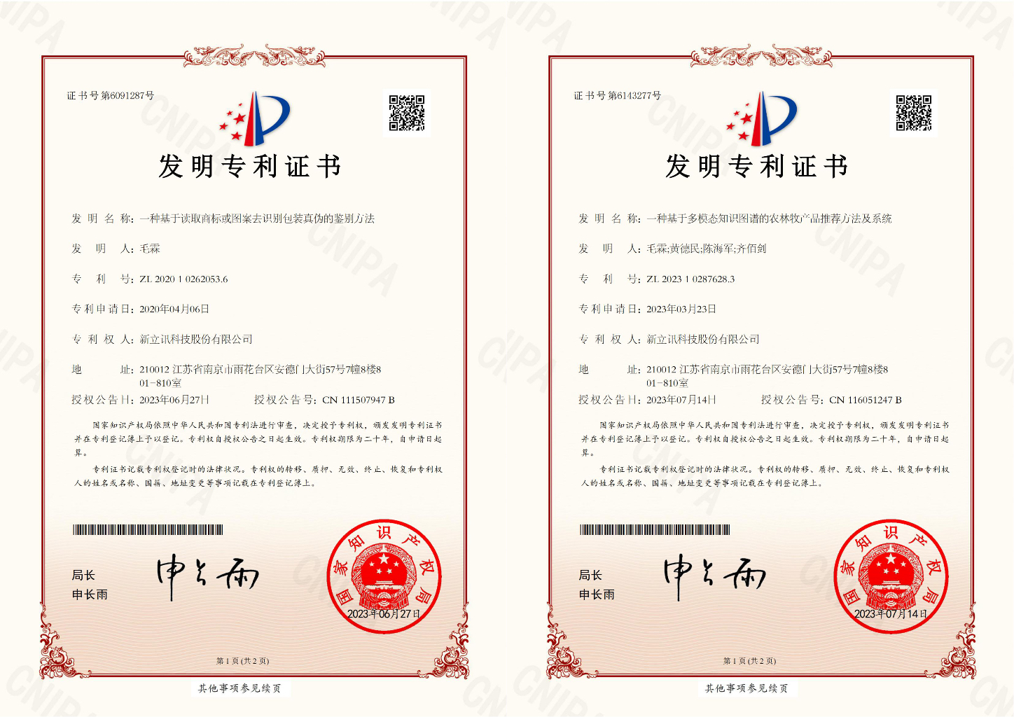 7月,新立訊知識(shí)產(chǎn)權(quán)領(lǐng)域再獲兩項(xiàng)發(fā)明專利,分別是“一種基于讀取商標(biāo)或圖案去識(shí)別包裝真?zhèn)蔚蔫b別方法”(專利號:ZL202010262053.6),“一種基于多模態(tài)知識(shí)圖譜的農(nóng)林牧產(chǎn)品推薦方法及系統(tǒng)”(專利號:ZL202310287628.3)均為我司原始取得,是技術(shù)創(chuàng)新和研發(fā)方面取得的重要成果。